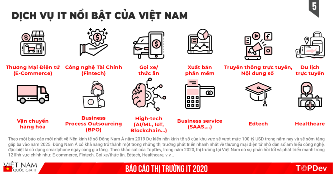 Theo một báo cáo mới nhất về Nền kinh tế số Đông Nam Á năm 2019, dự kiến nền kinh tế số của khu vực sẽ vượt mức 100 tỷ USD trong năm nay và sẽ sớm tăng gấp ba vào năm 2025. Đông Nam Á có khả năng trở thành một trong những thị trường phát triển nhanh nhất về thương mại điện tử nhờ dân số am hiểu công nghệ, đặc biệt là sử dụng smartphone ngày càng gia tăng. Theo khảo sát của TopDev, trong năm 2020, thị trường tại Việt Nam có sự phản hồi tốt và phát triển mạnh trong 12 lĩnh vực chính như: E-commerce, Fintech, Gọi xe/thức ăn, Edtech, Healthcare, v.v….