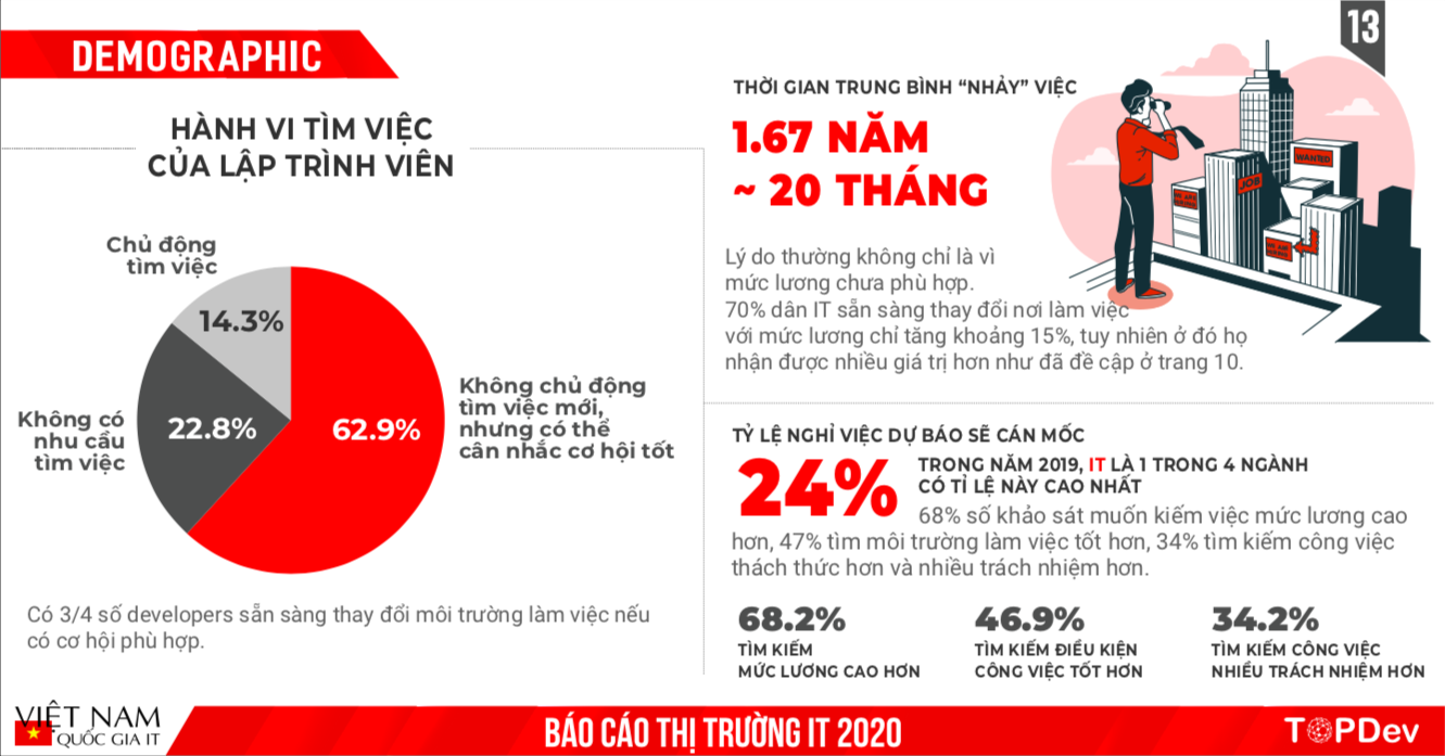 Tìm kiếm nhân tài là một chuyện, giữ chân nhân tài là bài toán khó giải khác dành cho doanh nghiệp khi IT là 1 trong 4 ngành có tỷ lệ nghỉ việc cao nhất, với 20 tháng là thời gian trung bình cho một lập trình viên “nhảy” việc, và tỷ lệ nghỉ việc đạt mốc 24% trong năm 2020. Lý giải cho những con số này, báo cáo IT của TopDev phân tích câu trả lời không nằm ở mức lương, bởi khi được trao công việc mới, mức lương của lập trình viên chỉ tăng 15%, mà giá trị họ nhận lại nằm ở những điều kiện khác nhau, đứng đầu là nhu cầu được đào tạo bài bản (43.2%) và lộ trình phát triển sự nghiệp rõ ràng (38.4%),….