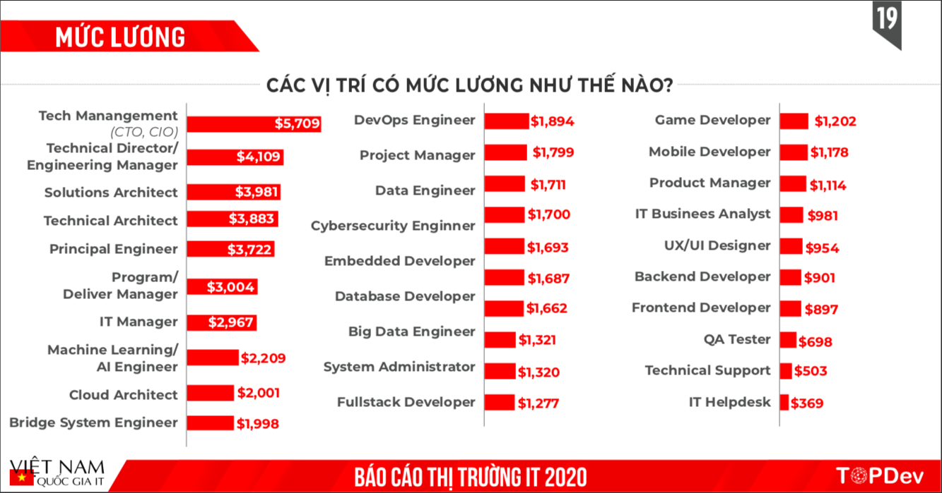 Vị trí Tech Management (nắm giữ vai trò CTO hay CIO của một công ty) có mức lương lên đến $5,700 USD (tương đương 132,291,000 đồng), và $1,329 (tương đương 30,8 triệu đồng) là mức lương trung bình doanh nghiệp sẵn sàng trả cho người có kinh nghiệm và tỉ lệ tăng lương sau 1 năm làm việc đạt 12 – 18%. Với mức lương khoảng 38,165,000 đồng/tháng, TensorFlows hiện là công nghệ được trả lương cao nhất, theo sau là Kubernetes và Go (33,577,000/ tháng với 28,270,000 đồng/tháng).