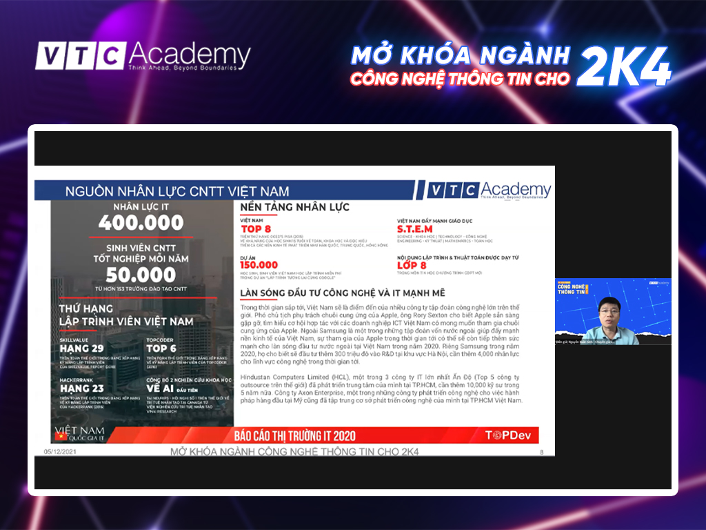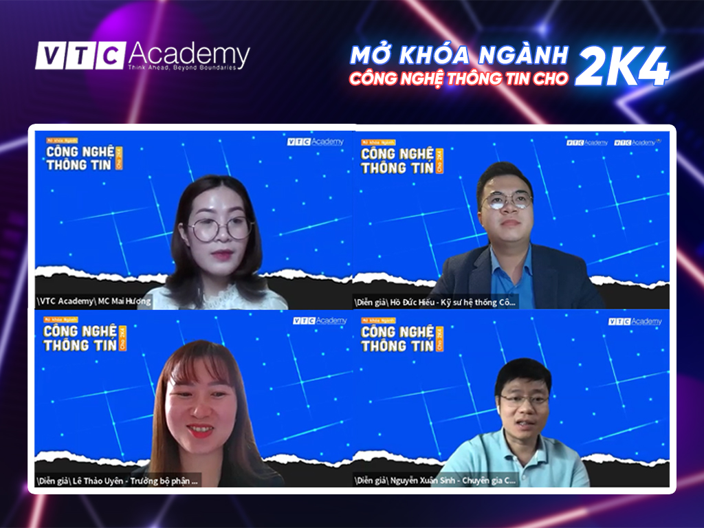 Chương trình hướng nghiệp là một trong những hoạt động thường niên do Bộ Giáo dục và Đào tạo đồng hành cùng Học viện VTC Academy tổ chức trong những năm gần đây nhằm triển khai Đề án 1665 về “Hỗ trợ học sinh sinh viên khởi nghiệp đến năm 2025” trên toàn quốc. Và Talkshow hướng nghiệp trực tuyến “Mở khóa ngành Công nghệ thông tin cho 2K4” là sự kiện mở đầu cho chương trình hướng nghiệp năm nay đã được diễn ra vào Chủ nhật, ngày 05/12/2021 vừa rồi với sự tham gia của đông đảo các bạn học sinh lớp 12 đến từ nhiều trường THPT trên cả nước.