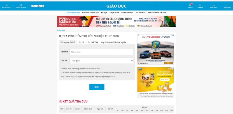 Các trang Web hỗ trợ tra cứu điểm theo số báo danh:
