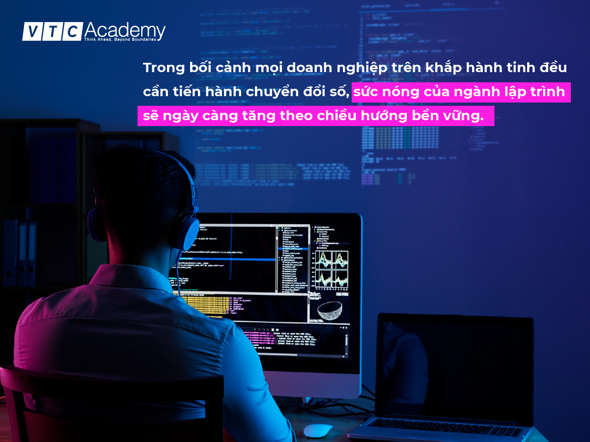 Lập trình và các ngành liên quan: Sau những tác động rất lớn từ đại dịch Covid-19, các nhà lãnh đạo doanh nghiệp dù ở quy mô lớn hay nhỏ đều đã nhận thức một cách sâu sắc về mối liên hệ mật thiết giữa khả năng hoạt động theo hình thức online trong mọi khía cạnh như vận hành, marketing, khả năng làm việc từ xa tại nhà,… với tỷ lệ “sống sót” của doanh nghiệp sau biến cố. Trong bối cảnh đó, mọi nhà quản lý đều mong muốn đẩy mạnh tiến trình số hóa (chuyển đổi số) cho doanh nghiệp của mình. Đây là một trong những yếu tố quan trọng khiến cho nhu cầu nhân lực ngành CNTT nói chung và lập trình nói riêng tăng rất cao trong thời gian tới. Có thể khẳng định, sức nóng của ngành lập trình sẽ ngày càng tăng theo chiều hướng bền vững, bởi lẽ công cuộc số hóa không thể thành công nếu thiếu sự tham gia của các chuyên viên lập trình. Mặt khác, chính phủ cũng sẽ có những giải pháp quyết liệt nhằm giảm bớt đội ngũ nhân lực cồng kềnh đang làm việc tại các cơ sở hành chính công. Một minh chứng rõ ràng của hướng đi này là việc thúc đẩy người dân sử dụng cổng dịch vụ công quốc gia từ năm 2019. Điều này cũng kéo theo nhu cầu rất lớn về nhân lực ngành CNTT nói chung và lập trình nói riêng trong cả tương lai ngắn và dài hạn.