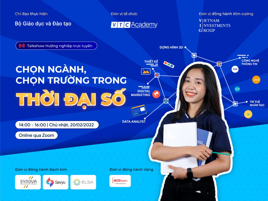 Nằm trong khuôn khổ chương trình, ngày 20/02/2022, buổi Talkshow hướng nghiệp trực tuyến “Chọn ngành – Chọn trường trong thời đại số” do VTC Academy chủ trì tổ chức dưới sự chỉ đạo của Bộ GD&ĐT sẽ cung cấp cho các bạn những thông tin cần thiết, những kinh nghiệm, bài học hữu ích để bạn có thể đưa ra những lựa chọn về ngành nghề, trường học phù hợp với đam mê và năng lực của bản thân.