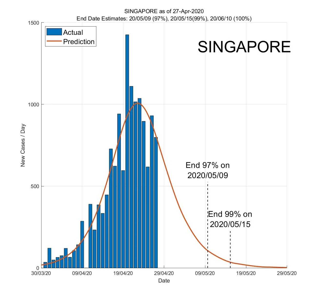 Theo dự báo, Covid-19 có khả năng sẽ kết thúc tại Singapore vào ngày 9/5 là 97%, vào ngày 15/5 với 99% và vào ngày 10/6 là 100%.